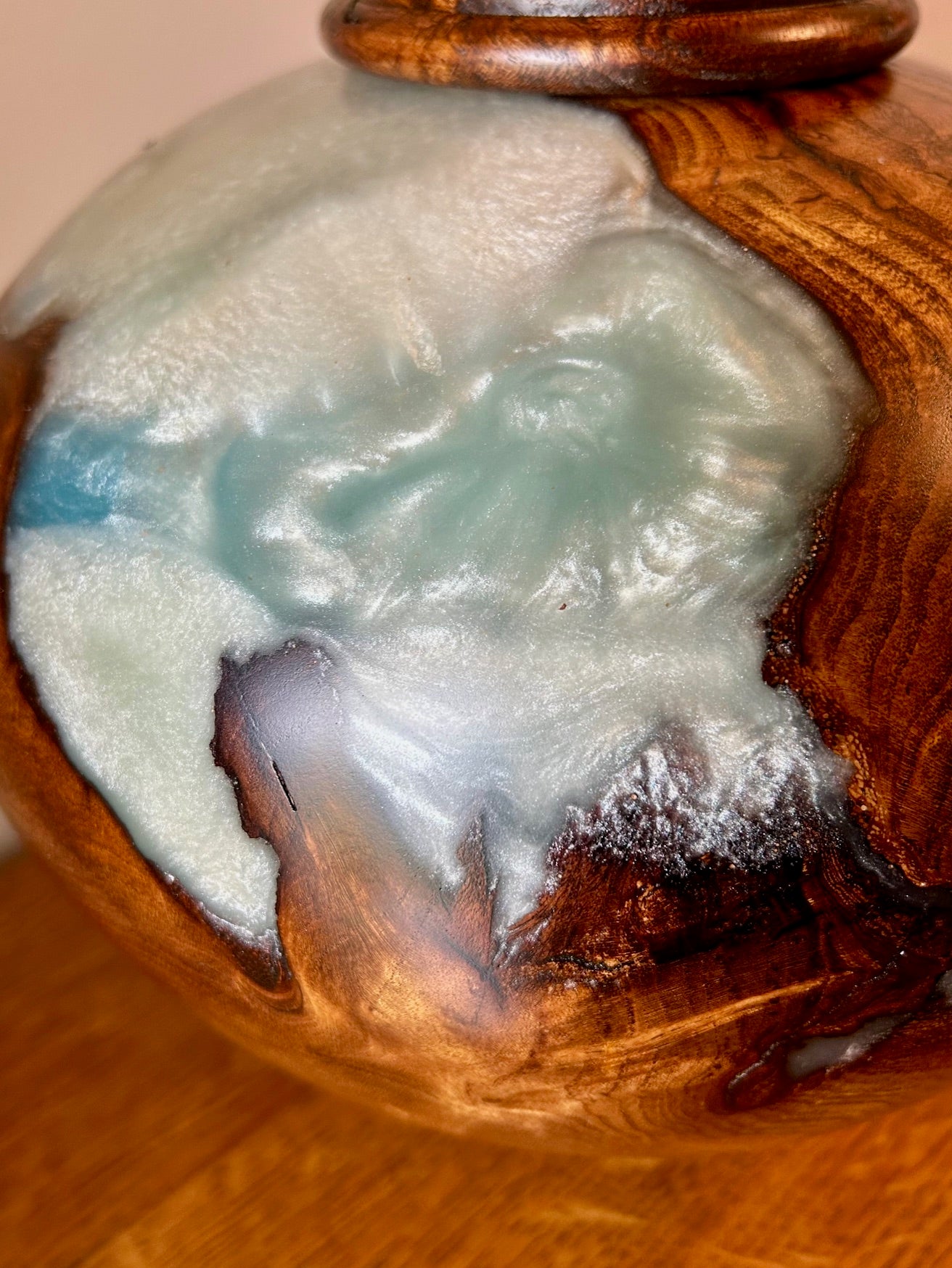 This elegant Mulberry Burl individual size urn is hand turned with lots of attention to detail. The urn is dyed with the visually striking red mahogany stain and has the lacquer finish with epoxy fill. The threaded lid has an elegant abalone shell encased in epoxy. Noteworthy: wood for this urn is sourced from the national historic landmark: the Blandwood Mansion (a historic house museum) in Greensboro, North Carolina.
